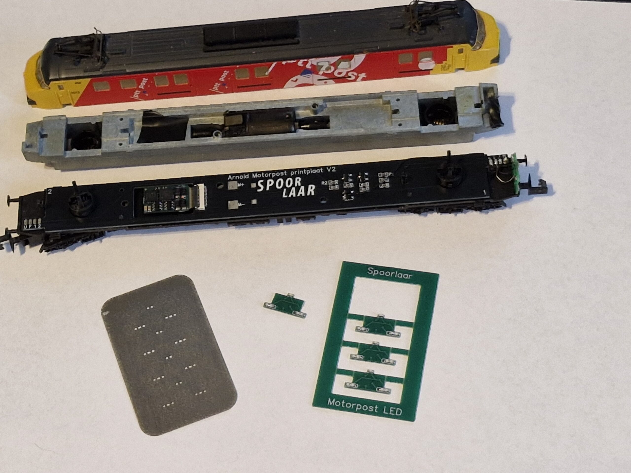 Before placing the circuit board, solder the LED PCB to the ends of the circuit board with the wire provided (The different solder pads have a number or letter). Bend the LED PCB 90 degrees so that it is now forward. Now insert the circuit board into the plastic chassis. Connect the decoder board to the circuit board with the flat wire and install the decoder. The metal chassis can now be mounted after applying a piece of insulating tape to the areas where the LED prints and the space above the decoder. Remove the light guides from the hood and fill the holes with Crystal Klear. The cap can now be installed.
